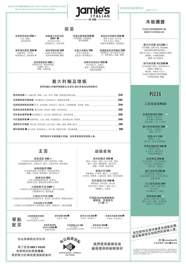 Jamie’s Italian Taiwan的新菜單,從前菜、義大利麵、燉飯到PIZZE,所有的菜色皆是由台灣將食譜與料理方式回饋到英國Jamie Oliver總部做試作,遇到有需要調整的,再以互相討論,雙方面確認無誤始可放上菜單,Jamie Oliver總部對於食材來源的要求相當嚴苛,所有食材都必需是Jamie Oliver所認可的飼養及栽種方式,所以在Jamie’s Italian Taiwan吃到的都是健康安全衛生無虞的食材