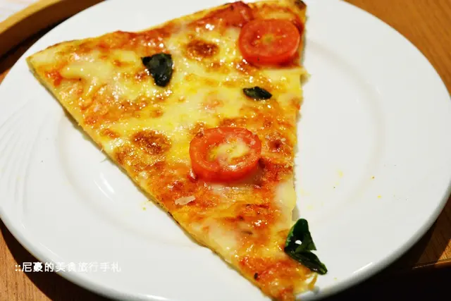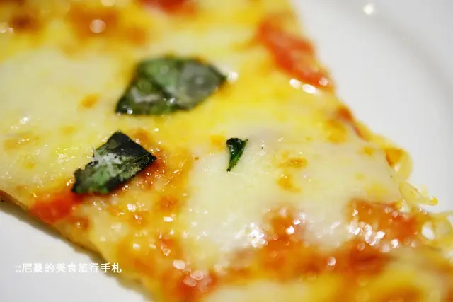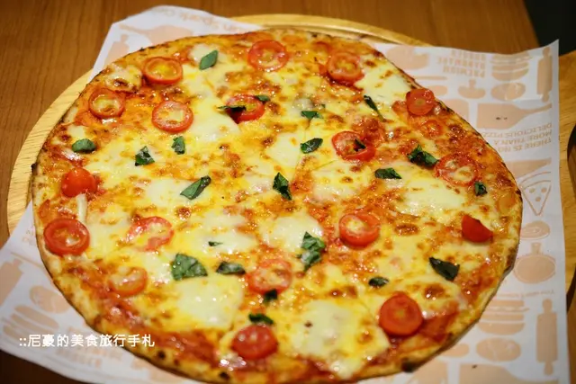 薄皮的披薩加上厚厚起司令人食指大動,上面主要有番茄、羅勒等等配料