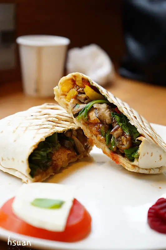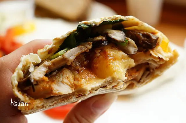 雞肉磚餅的做法是用墨西哥餅皮把料放進去以後再用panini機壓烤