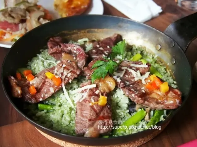 羅勒沙朗牛排好飯$400(牛排煎的還OK。飯裡面有羅勒的香,以及蘆筍的口感。味道是真的不錯,但飯還是一樣軟。我們已經特地等好陣子再拌飯,但期待的鍋巴還是沒出現。)