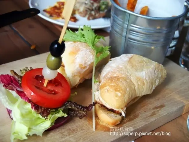 紅甜椒雞肉西班牙三明治$260(是不太清楚哪裡有放紅甜椒,還是用紅甜椒醬?不過醬汁記得是黃色的。其實覺得他們家的醬都調的還不錯,帶些微甜,跟烤雞肉很搭配。而且薯條是我喜歡的seasoned fries風格,好吃,推!)