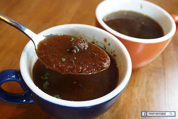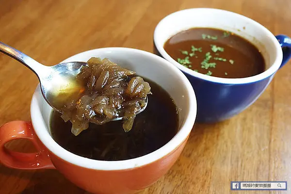 「洋蔥湯」濃淡適中喝起來順口又帶點甘甜,和羅宋湯一樣湯頭中有牛肉入味的一道湯品。