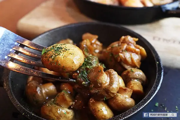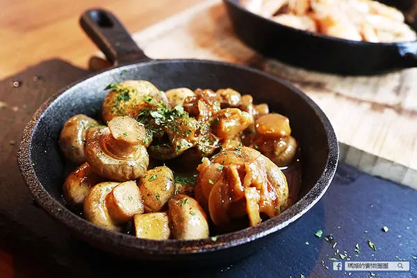 「蒜香多汁蘑菇」180元,用小鐵鍋盛裝,以大量橄欖油加蒜頭下去拌煮入味,最後再灑上巴西里增加香氣。
