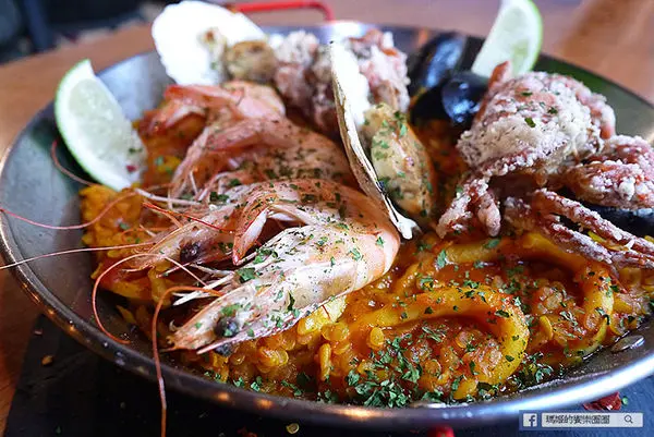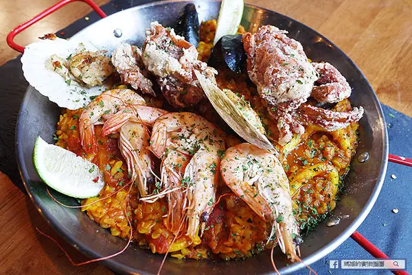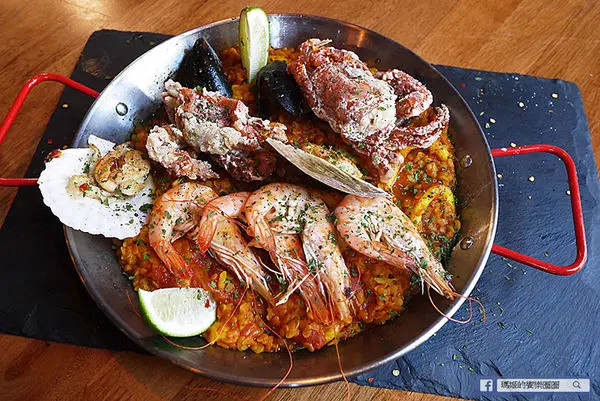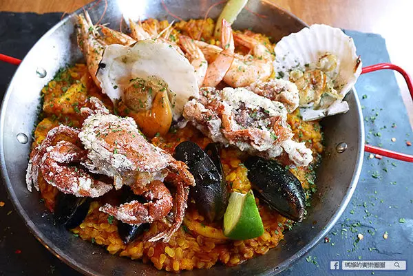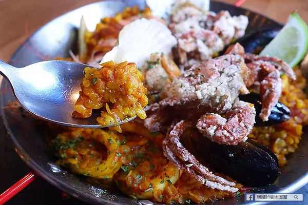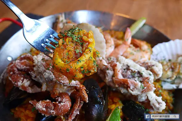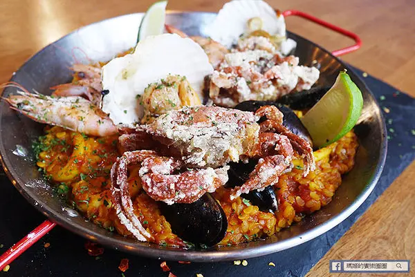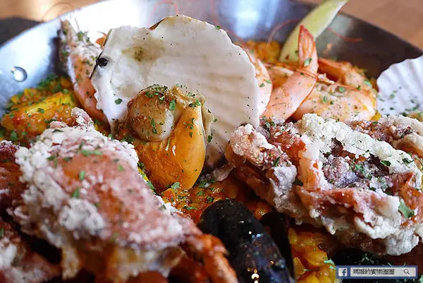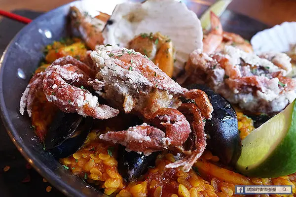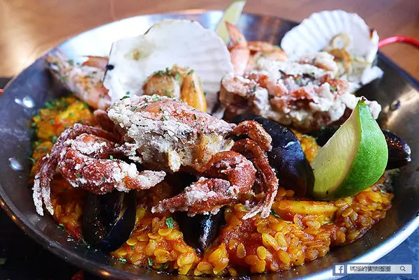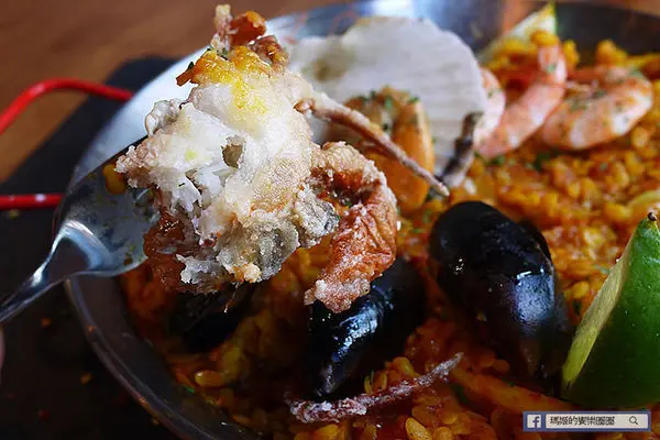 「酥炸軟殼蟹西班牙海鮮燉飯」880元,這為兩人份的份量,上頭佈滿海鮮料,讓人目不暇給。