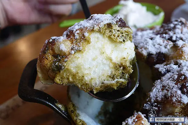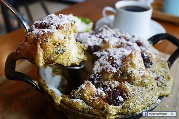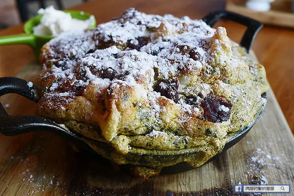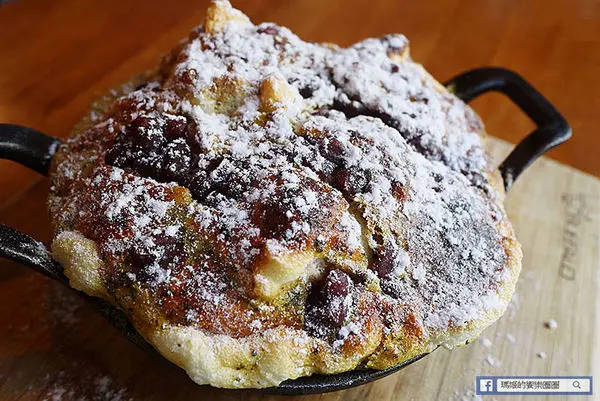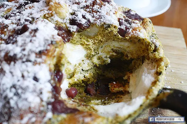 這舒芙蕾鬆餅發得好膨,上層看到有一顆顆的紅豆,和微微的抹茶粉,出爐後灑上細緻的糖霜,吃的時候拿湯匙從頂端挖到底一口吃,在還沒開挖前很好奇裡面是有什麼特別的內饀呢?!
