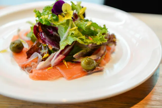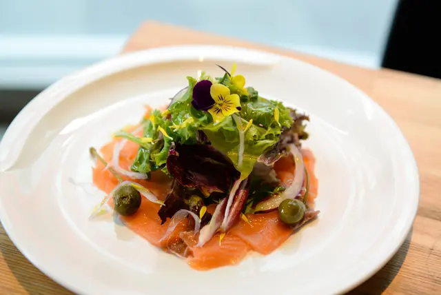 鮭魚盤上佐了大量生菜,洋蔥