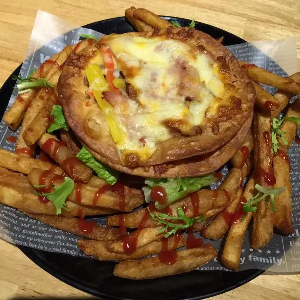 Pizza千層塔、KISS紅燒精燉牛肉麵、花生冰沙、點心炸雞翅+飲料x2杯