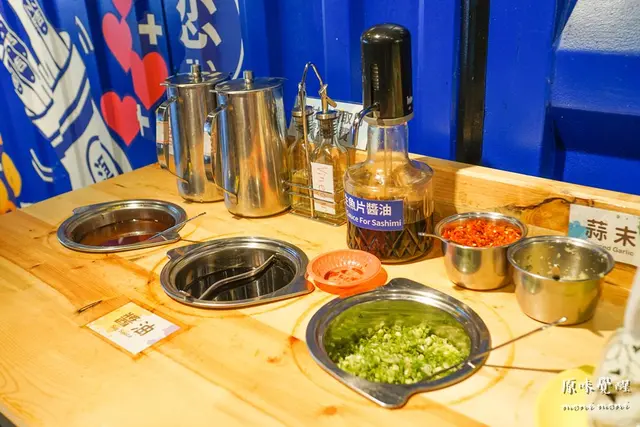 自助吧的部分有免費的醬料台可以取用,和風醬油、沙茶、蔥花、蒜末、辣椒、生魚片醬油都在這裡取拿。