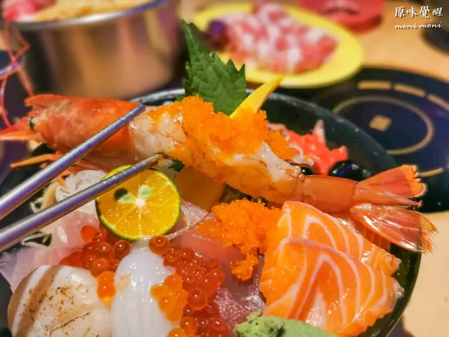 尤其上面居然有牡丹蝦、干貝、花枝、鮭魚卵、蝦卵、鮪魚、鮭魚生魚片等等。