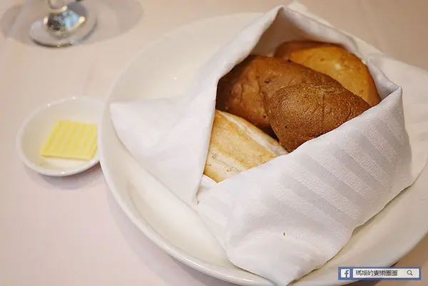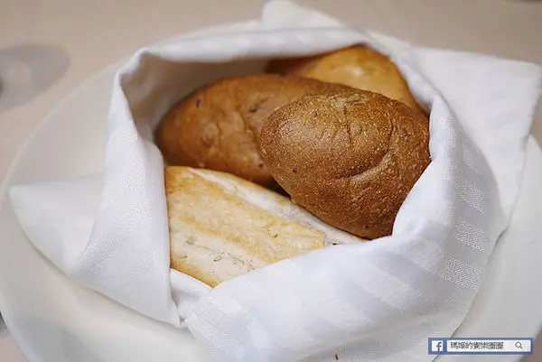 決定餐點後先送上歐式麵包,搭配奶油使用。出餐時特別用布包裹著保溫,每個人有葵花子橙皮麵包與雜糧麵包各一個。