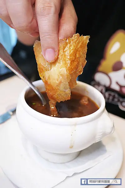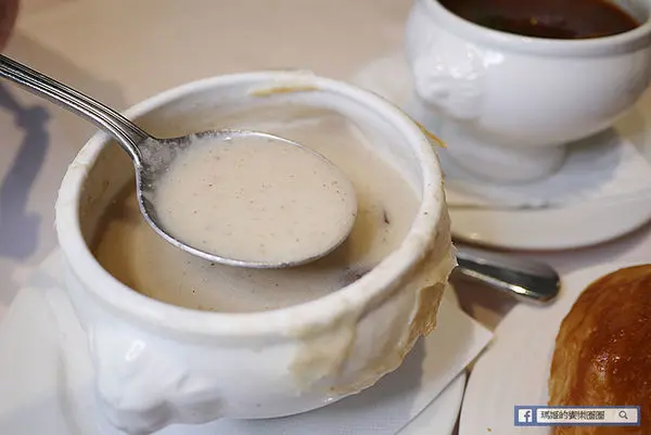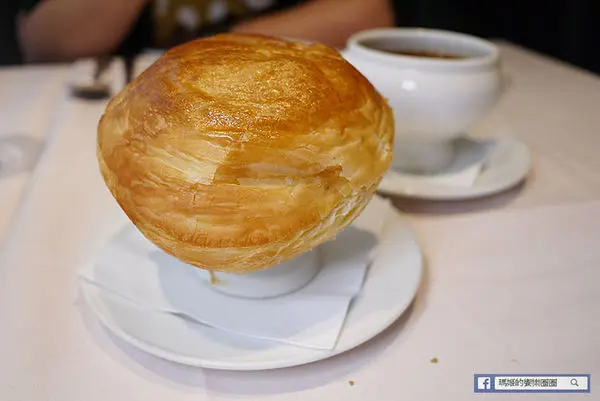 酥皮蘑菇湯上桌後,服務人員會先將酥皮取下放在小盤上並建議將酥皮切小塊沾著蘑菇湯吃避免泡爛。瑪姬先單喝一口蘑菇濃湯,這湯很燙建議先慢慢攪拌放涼後再慢慢品嚐。一般濃湯喝多會膩口,這裡的濃湯香濃順口,有著濃厚的蘑菇香氣,搭配酥皮一起吃又增加豐富口感。