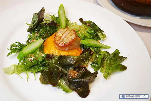 櫻花蝦干貝也是一道美味又經典的前菜,選用北海道生食級干貝,採用高溫大火把外層煎成金黃色並將干貝內層的鮮美滋味都鎖在裡面,起鍋後放入生菜圈成的中心點上,底下再用紅蘿蔔奶油醬襯底,再淋上雅室獨家煉製的櫻花蝦油,襯托出干貝的鮮甜多汁口感。