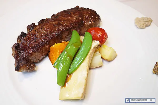 搭配牛排的季節時蔬,有甜豆、杏鮑菇、馬鈴薯、地瓜和蕃茄,主要以根莖類為主,同時增加膳食纖維和飽足感。