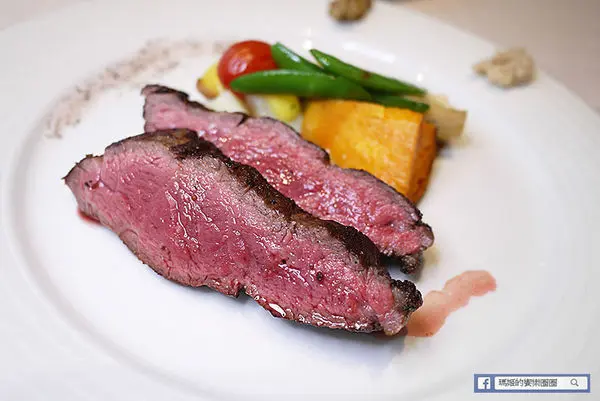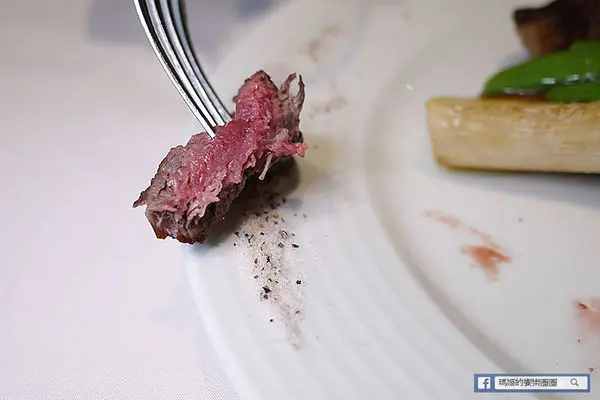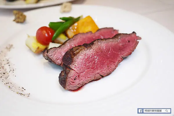 切開來呈現淡粉紅不帶血水的肉汁,這樣的五分熟度嚐起來柔嫩中不失彈性,很容易咀嚼,嚐在嘴裡的滿是甜美的肉汁,還有外層香酥脆口的味道。