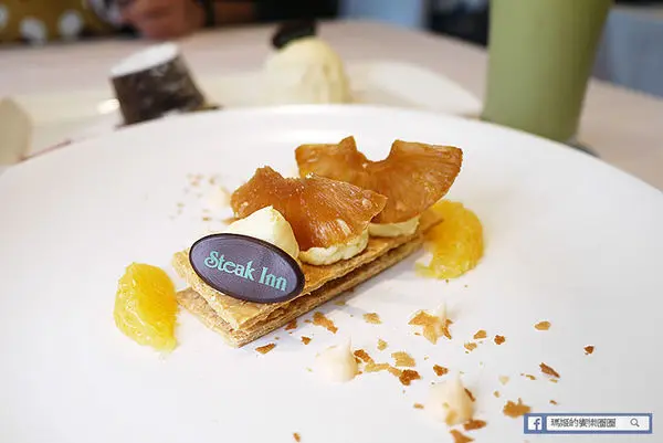 四季水果塔之夏日鳳梨派,雅室以四季水果為主軸,會推出各種期間限定的水果塔,鳯梨派正是目前夏季的酸甜水果代表,以兩塊千層酥皮夾著燉煮至軟綿但帶有纖維的鳳梨內餡,上頭還有用新鮮鳳梨自家烘烤的果乾點綴,旁邊再以橙汁口味的卡士達醬裝飾,口感甜而不膩又非常賞心悅目的一道甜點。