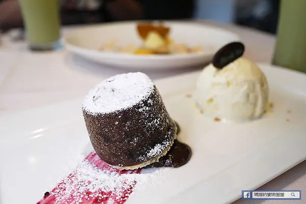 切開溫熱的布朗尼裡,流出的滿是來自法國進口70.5%苦甜巧克力熔岩,和外層甜味較重的布朗尼蛋糕體一起吃中和甜度,也溫暖心房,或是搭配沁涼冰心的香草冰淇淋一起入口,冷熱交織又帶來味蕾的衝擊。女生胃裡總有甜點的一個位置,充份表現在這二道甜點裡。