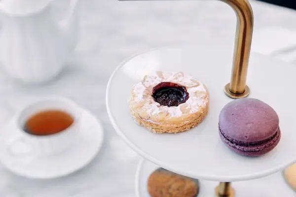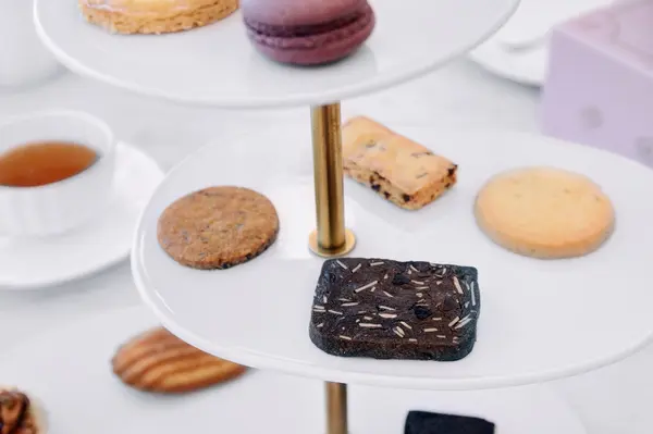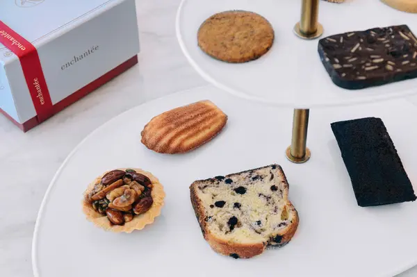 如果要前來試吃,必須於三日前預約,一組試吃喜餅門市品嘗費用 NT$180 元,一次可以試吃十款喜餅,當天品嘗的口味跟大家分享一下。「藍莓馬卡龍」,這款是主廚改變配方的常溫馬卡龍,手作藍莓果醬裏面沒有傳統中會使用的鮮奶油,改以藍莓醬製作,口感品嘗起來像餅乾,酥脆感十足,這款會改變作法就是希望可以常溫搭配在喜餅禮盒中;「檸檬香草瑪德蓮」、主廚以新鮮檸檬製作的瑪德蓮,而非使用一般的檸檬濃縮液,並且將檸檬上方刨絲入甜點中,因此品嘗起來相當淡雅清爽;「巧克力可可費南雪」、「法國苦甜巧克力杏仁餅乾」,enchantée 樂朗奇,喜餅中巧克力系列的我都很喜歡,使用純正巧克力,整體口感是帶點苦味入點甜,巧克力可可費南雪,相當滋潤像蛋糕,又像鬆餅般的口感,而法國苦甜巧克力杏仁餅乾,則是除了我最愛的苦甜巧克力滋味以外,還有滿滿杏仁香氣在其中;「蔓越莓方餅」,這款使用只有蛋白,沒有蛋黃,所以口感相對比較酥脆,而其中吃的到一顆一顆蔓越莓果乾,酸酸甜甜,我覺得是喜餅中不可少的平衡滋味;「匈牙利紅椒起司餅乾」,這款是喜餅中的鹹食系列,雖然名稱是匈牙利紅椒,但其實口感的辣度是來自辛香料的刺激度,而非真正的辣度,我覺得在喜餅中,加入這款鹹食相當適合;「藍寶石蜂蜜磅蛋糕」,以藍莓果醬製作的磅蛋糕,含蘭姆酒,這款也有做成彌月禮盒,可以跟店家訂製整條蛋糕;「Sables 草莓沙布蕾」,這款中間主廚使用的是新鮮手作莓果醬製作,餅皮則是像細沙一樣纖細細柔,非常特別;「布列塔尼酥餅」,這款是法國西北部布列塔尼區傳統點心,口感偏向乳酪起司奶香,我覺得有點烤布丁的香氣在裏頭,然後略帶鹹味的自然奶香;「蜂蜜堅果塔」,主廚用買回生的堅果,南瓜子、核桃、腰果、杏仁烤過之後製作,堅果香氣十足,這款長輩應該都會很喜歡;「皇家伯爵茶圓檸檬圓餅」,採用唐寧 TWININGS 手工研磨伯爵茶粉,沒有香精味,反而是清新的茶香餅乾味,後勁則有點奶油香氣。