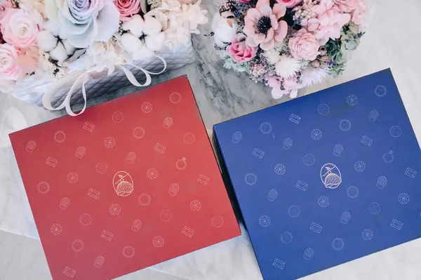 禮盒「Premium 頂級禮盒系列」,有分成藍、粉、綠色三款,而其中打開之後,裏頭則是搭配紅或藍色盒子,這款禮盒,裏頭有15入($868)、17入($948)、21入($1108)、23入($1188) 數量可以選擇,整體包裝色系相當法式優雅,粉色,我覺得很適合喜歡夢幻更加法式氛圍的女生可以挑選,而另外藍或綠,我覺得是能滿足不想太偏好公主風格系列的中性女生,或者是提供給老公想要送給同事的選項。除了這次我們看的「Premium 頂級禮盒系列」,現場也有其他款,像是「Classic 經典禮盒」– 經典悅人、「Classic 經典禮盒」 – 盛放時刻,而我跟妹妹最喜歡的莫過於下圖這幾款的「Premium 頂級禮盒系列」,盒體很特別的是硬殼之具有厚度與重量,一般喜餅禮盒來說,多半在裏盒上都是單層容易因為擠壓而變形或有折橫,但「Premium 頂級禮盒系列」,屬硬殼且具有份量,質感度十足,「經典系列」則是採用手感絕佳、榜上有名的美術紙,我與妹妹還是第一次遇到手工喜餅店如此用心在禮盒的硬度設計上,替整個喜餅增添了不少更貴氣的質感。