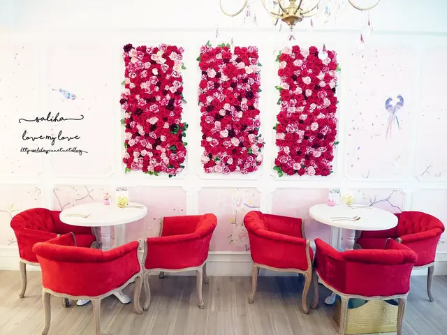 大門附近的是甜蜜的玫瑰花牆跟紅白座椅,