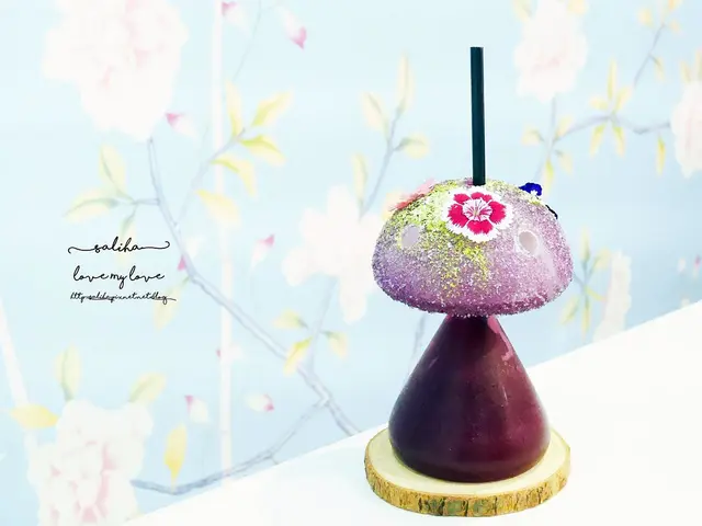 蘑菇造型的器具,頂上配上滿滿的白糖跟花瓣,