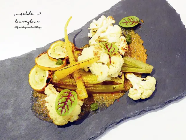 各式蔬菜與小花下藏著一塊厚厚的鵝肝,