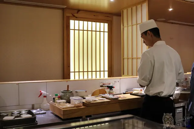 周六晚上客人不算太多,座位四面八方區圍繞著師傅的作業區,形成一個中空的長方形,我滿喜歡這樣的設計,吃壽司就是要距離師傅越近越好!因為中心是個開放的區域,所以看得師傅在處理魚料的樣子。