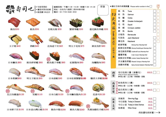 這樣的菜單設計我滿喜歡的,50元2貫的品項總共有17種,給小資族一個比較不傷荷包的選擇。現在很多連鎖迴轉壽司2貫的金額也差不多是這樣了,我會寧願來這裡吃。