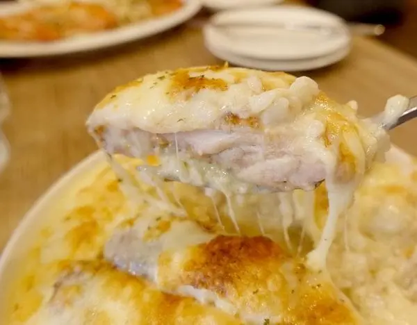完整的一隻雞腿排切好之後放在奶油飯上進去焗烤