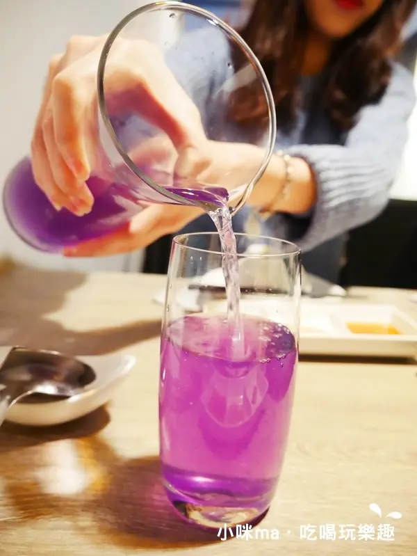 一上桌會提供清涼的飲料-蝶豆花檸檬水,淡紫色澤配上微酸的氣味,邊吃邊喝也不會搶了鍋物的香氣