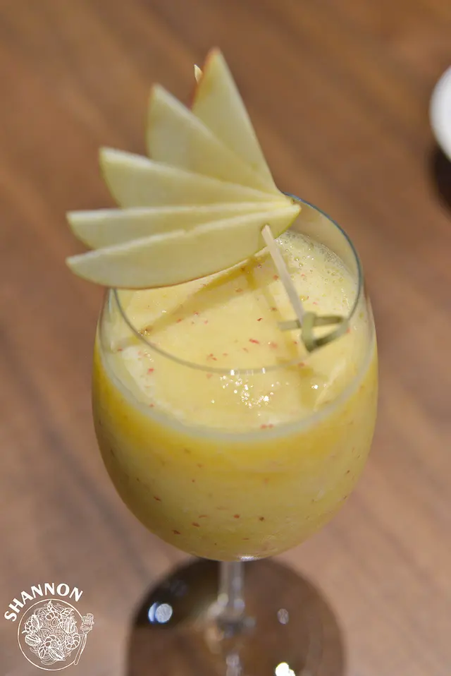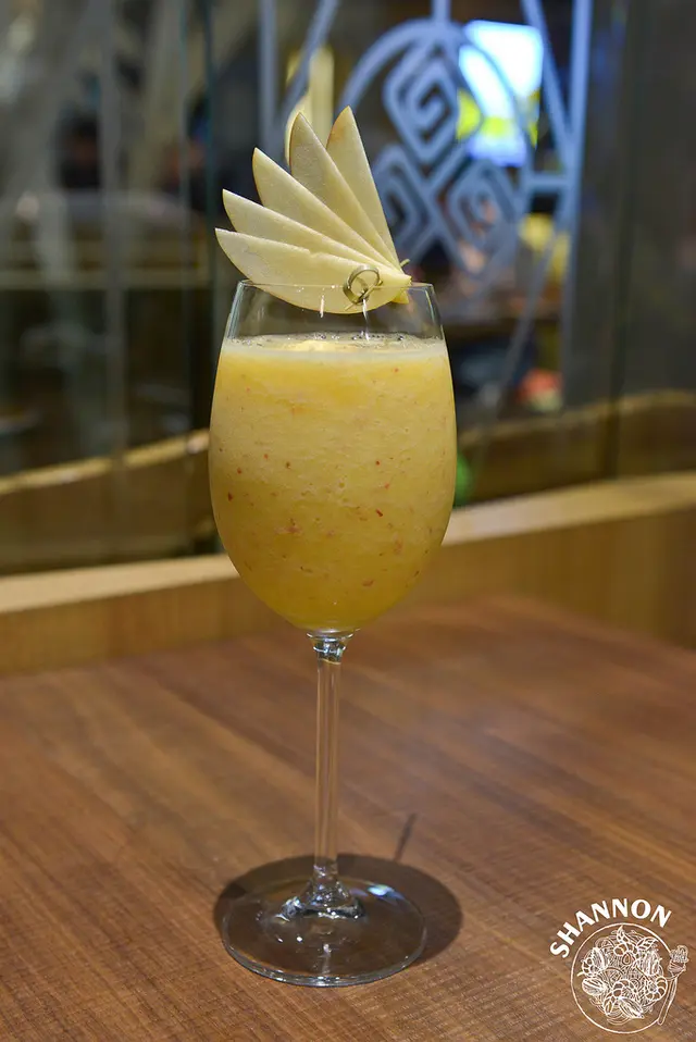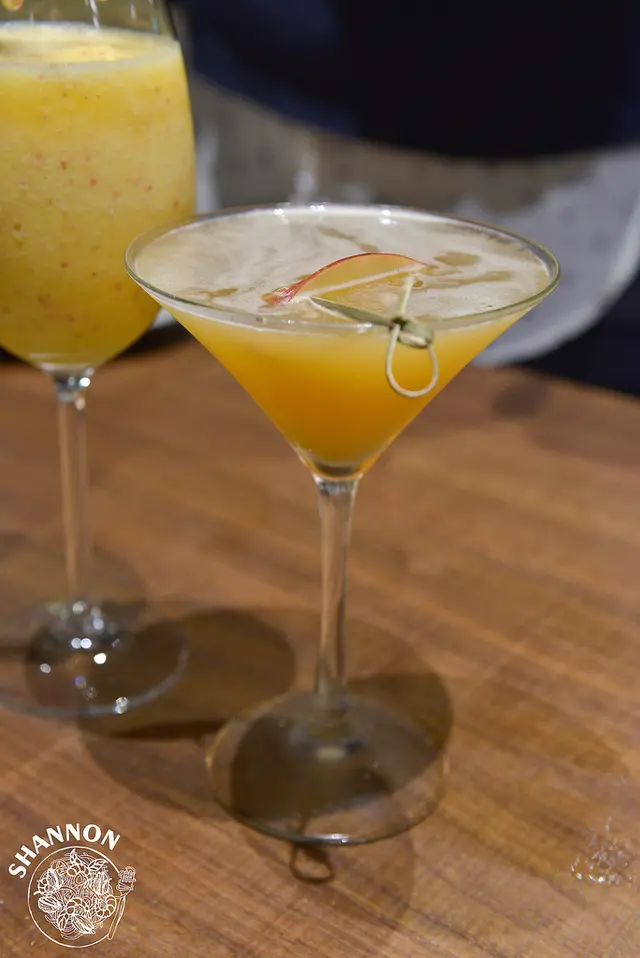 蜜桃蘋果凍飲蜜月 (未成年請勿飲酒)蘋果、白蘭地調製成的飲品酸酸甜甜甜的酒味有些重,所以我就沒這麼喜歡了!
