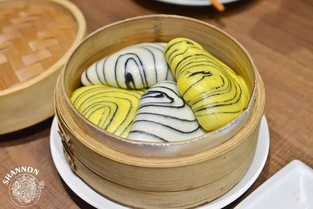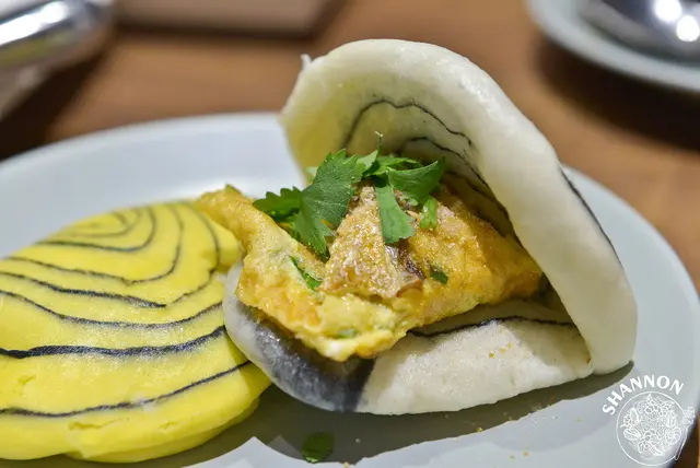 玉子一夜干搭配虎皮和斑馬紋刈包蒸籠