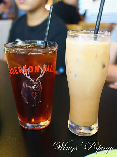 飲料都還蠻大杯的,紅茶少甜口感香醇,冰咖啡則是美式附上奶油球。