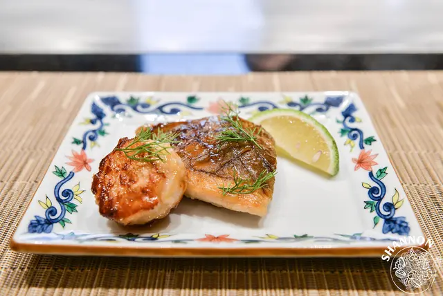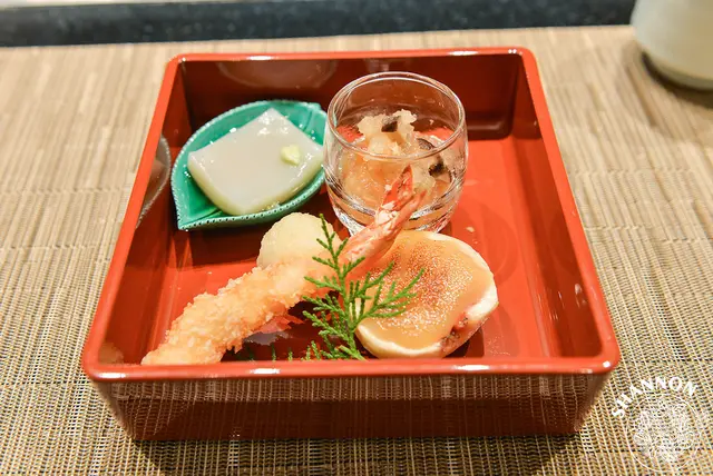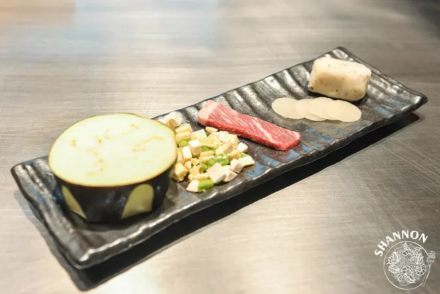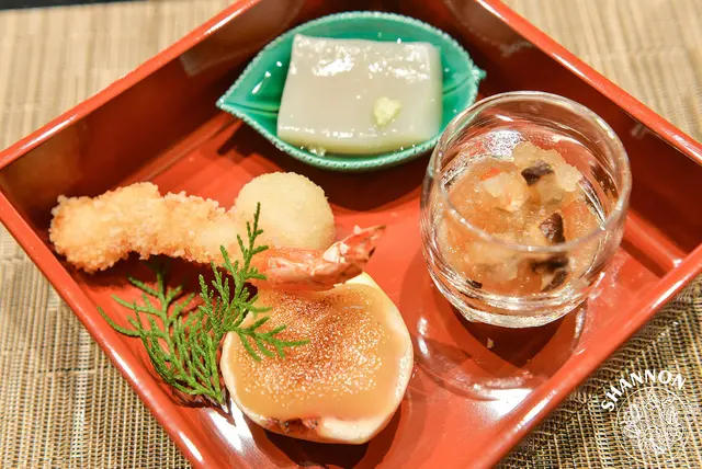 每個套餐都附上的開胃菜,上方為茄子豆腐口感軟嫩,但味道上我並不喜歡!左邊為炸明蝦及鴨肝球表現普通並無驚艷,右邊蘿蔔泥醬油與鮭魚卵、香菇,整體調味的很不錯吃起來鹹香帶一點甜,下面為味噌無花果第一次看到這樣的搭配,甜甜鹹鹹的很特別口感帶一點軟度我最喜歡這個了!