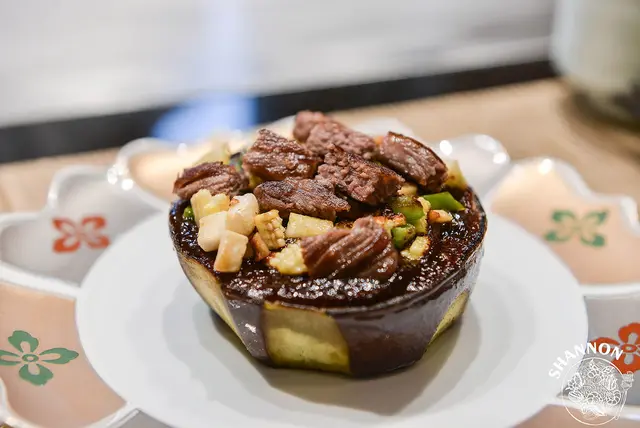 雖然我不喜歡吃茄子,但我還是有品嚐看看這茄子非常多汁,上方的料餡有玉米筍、杏鮑菇、沙朗牛及青椒,味道會是中間的京都紅味噌較明顯