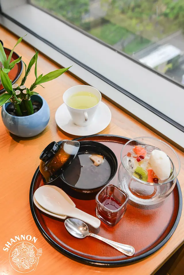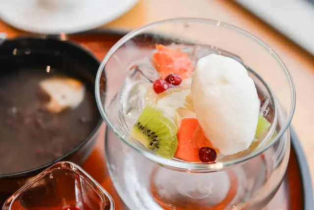 甜點季節水果果凍、麻糬紅豆湯搭配咖啡或日本產綠茶