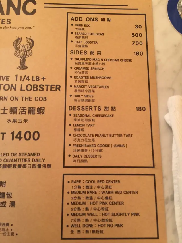 菜單的選擇也很簡單,主要的選擇就是肋眼牛排跟波士頓活龍蝦,