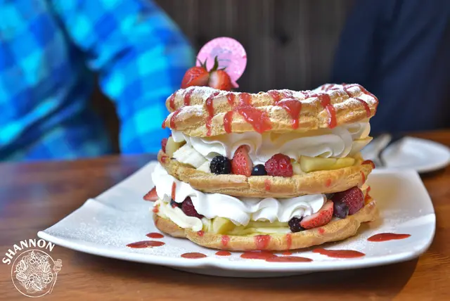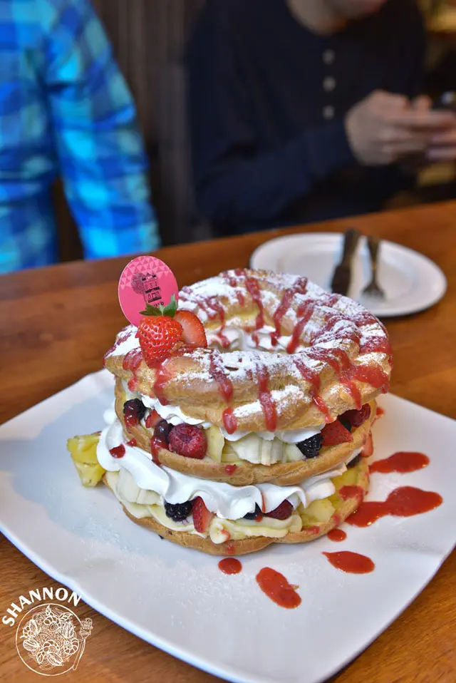 最後其實吃很飽了但是以經點了這個甜點必嚐一下,其實本來想要點的是厚鬆餅但是是下午才開賣...我們就轉來點這個新品,一上桌真得嚇死我們大家了!好大阿!!!外皮頂部有酥不過有點乾,裡頭放了香蕉、草莓、鳳梨及多種莓果,上夾著鮮奶油和卡士達醬,我自己是認為卡士達比鮮奶油甜了些,不過朋友寧可吃卡士達也不選擇奶油,我自己的話是吃不下太多..所以就還剩下了自己份量的一半...有些浪費但最好要有肚子吃下度才點用此道料理比較好!