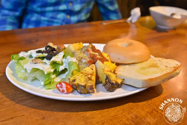 看起來算是還蠻豐富的希望生菜可以再多一點,S說烤過的鳳梨香氣還不錯,貝果稍微太彈牙了些(應該是冷氣關係)
