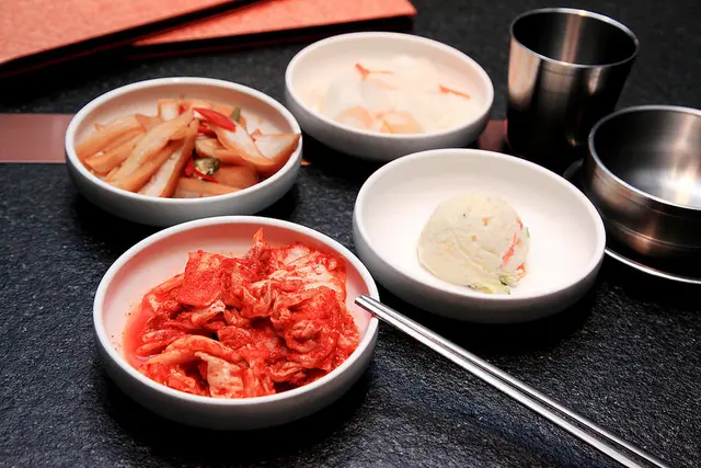 四品小菜,會隨著季節做改變,今天有韓式泡菜、馬鈴薯泥、醃蘿蔔、醃洋蔥