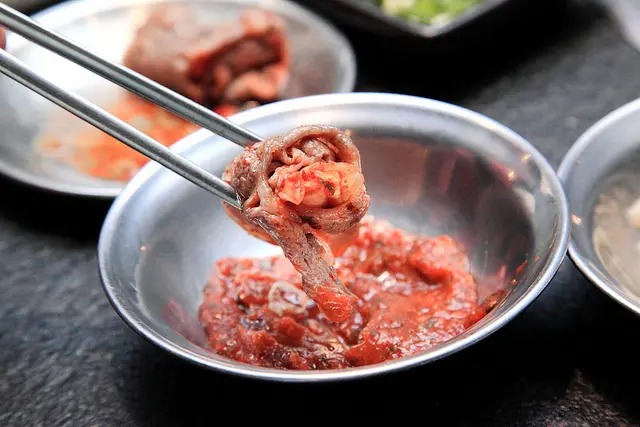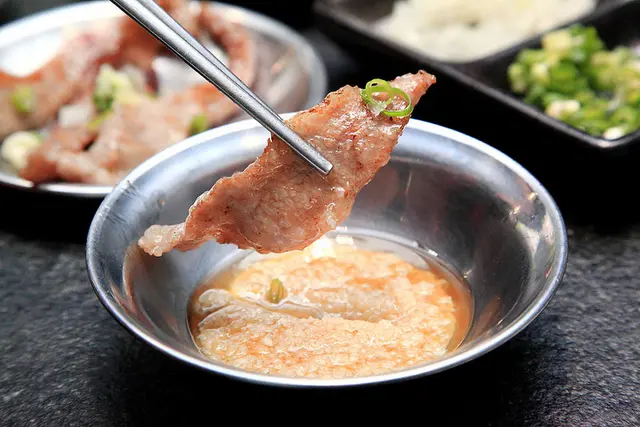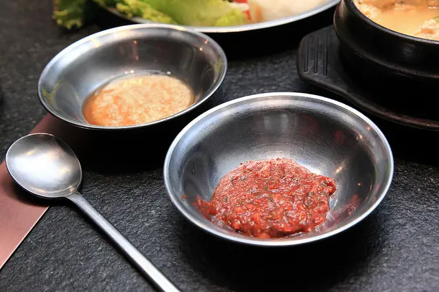 清潭洞提供兩種燒肉沾醬:頂級橄欖油加蒜泥海鹽,特製韓式燒肉辣醬~