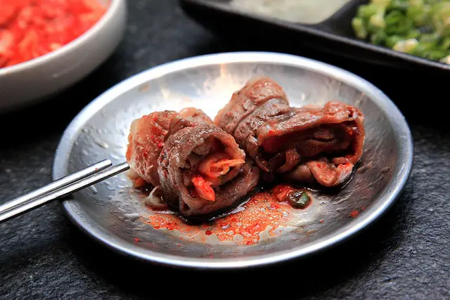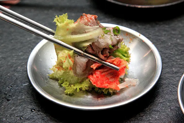 也可以包上泡菜,原本肉汁就相當豐潤的豬五花包上泡菜,口感更加多汁濕潤,味道也更豐富