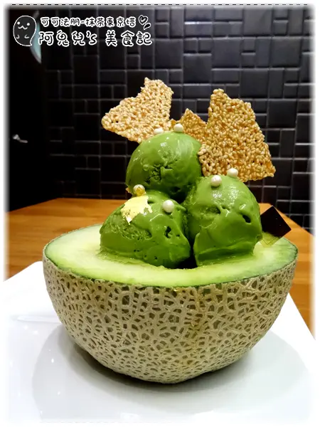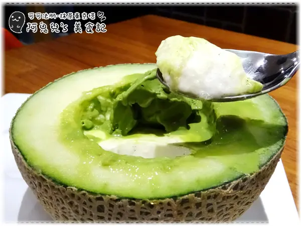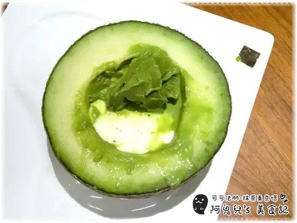這款甜點的外觀太霸氣了!直接送上半個哈密瓜!哈密瓜結合抹茶真的好特別