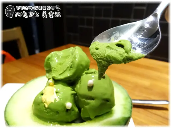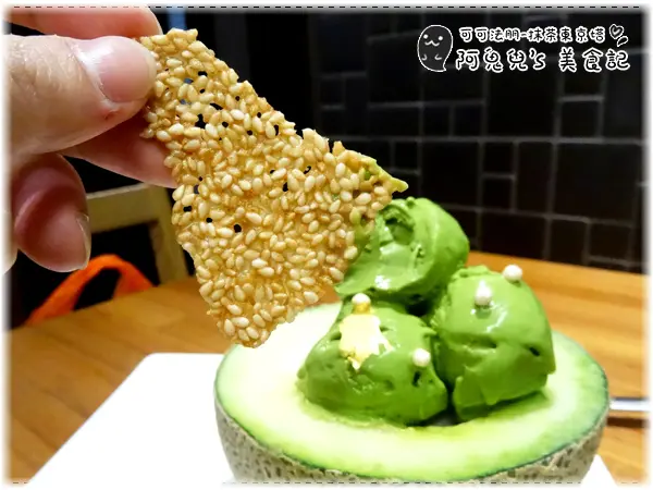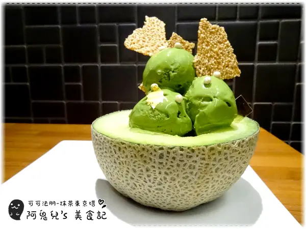哈密瓜上頭的抹茶冰淇淋是法朋使用小山園綠樹抹茶製作的,抹茶味好濃郁!