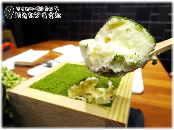 抹茶提拉米蘇上是厚厚的抹茶粉,下方是奶香濃郁的馬斯卡邦起司及手指餅乾