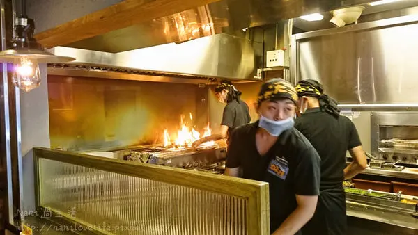 點完餐後找到個好座位可以直接目睹大火烹煮的感人時刻阿!!其實仔細一看會發現,大火快烤的區域主要是肉片為主,而腿排類則是在畫面右邊進行烹調,算是蠻明確的廚房分工。