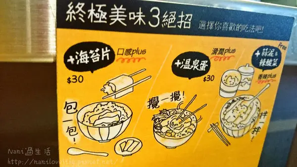 哈哈~Nani那天超猶豫的,結果選了腿排類,老實說黑豆醬醪的醃料味道和糖燻燒肉醬比起來較輕淡,腿排的表現普普,因此後半部我都是利用蒜泥和辣酸菜來搭配,不過值得提的是燒丼的米飯頗好吃的,Q彈不軟爛。
