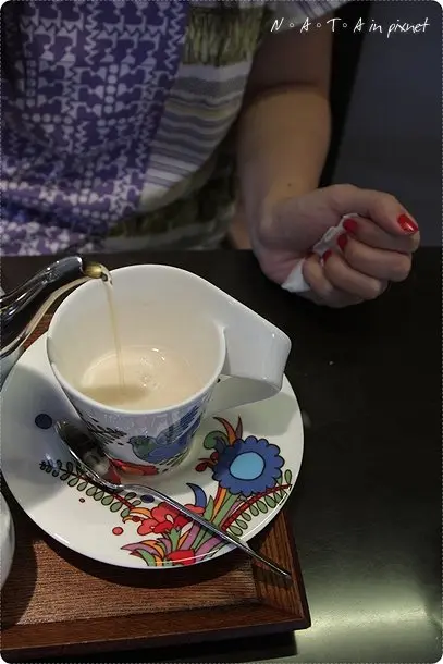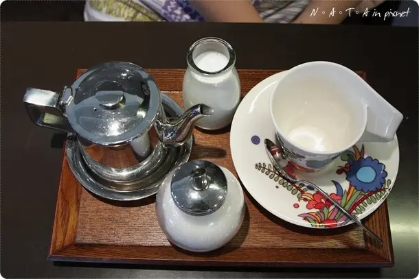 溫馨的木盤上,盛著花紋大膽的海芋造型磁杯、銀亮茶壺、玻璃奶瓶、造型糖罐,原以為僅是壺熱茶,沒想到擺置卻是一絲不茍,非常用心。