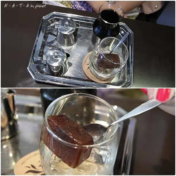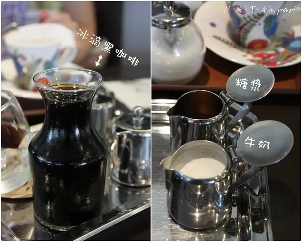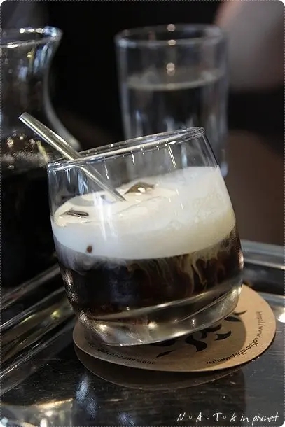 每日限量供應的冰滴咖啡,號稱十個鐘頭滲滴粹取,擺飾也是相當講究,透明玻璃壺中盛裝的是黑褐色的咖啡汁液,旋轉舞杯裡則裝有白水和咖啡、黑白兩色的冰塊,視覺上即予人極大的享受。