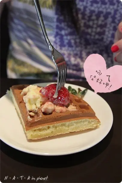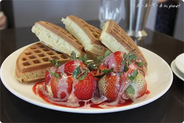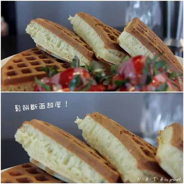 在這裡,絕對不用擔心吃到涼掉的鬆餅,現場可是有四台專業鬆餅機同時烘烤,讓熱騰騰的鬆餅隨時都能幸福登場。名聞許久的草莓冰淇淋鬆餅,才送上桌,那令人驚豔的夢幻,讓心好似都要融化了一般。新鮮對切的嬌紅草莓,淋滿亮澤的煉乳和莓醬,搭配一球草莓冰淇淋和一球卡士達奶油醬,香濃滑瞬的冰淇淋和清爽酸甜的草莓,真是天作之合!厚實熱燙的鬆餅,斷層厚度約莫兩公分高,烘烤的色澤十分均勻,綿密實在,但口感卻相當蓬軟,外酥內軟,傳聞中的「夢幻鬆餅界霸主」,果真實至名歸!