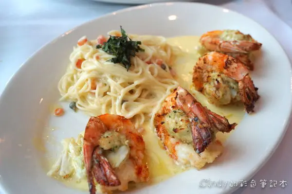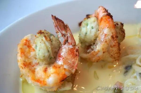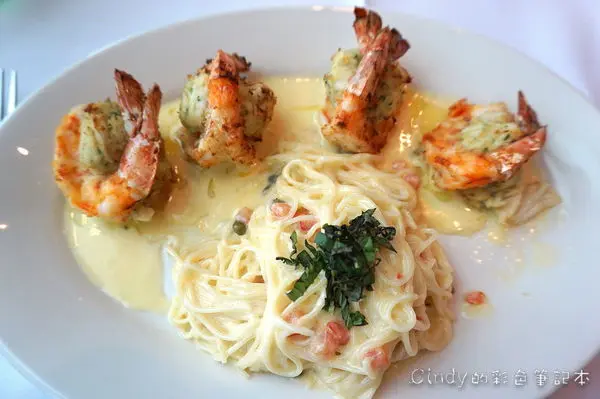 這綠油油的沙拉跟我今天的衣服好配 XDDDD烤蟹肉釀蝦配義大利天使麵 1080元(套餐價) 988(單點價)